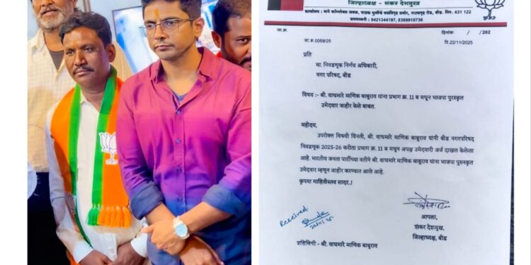 बीड प्रतिनिधी : प्रभाग क्रमांक ११ ‘ब’ मधील उमेदवारी अर्ज बाद झाल्यानंतर भाजपने तातडीने निर्णय घेत माणिक बाबुराव वाघमारे यांना पुरस्कृत उमेदवार म्हणून जाहीर केले आहे. हा निर्णय डॉ.योगेश क्षीरसागर यांच्या नेतृत्वाखाली पक्षाने सक्षम उमेदवार पुढे करण्याच्या भूमिकेतून घेण्यात आला आहे.