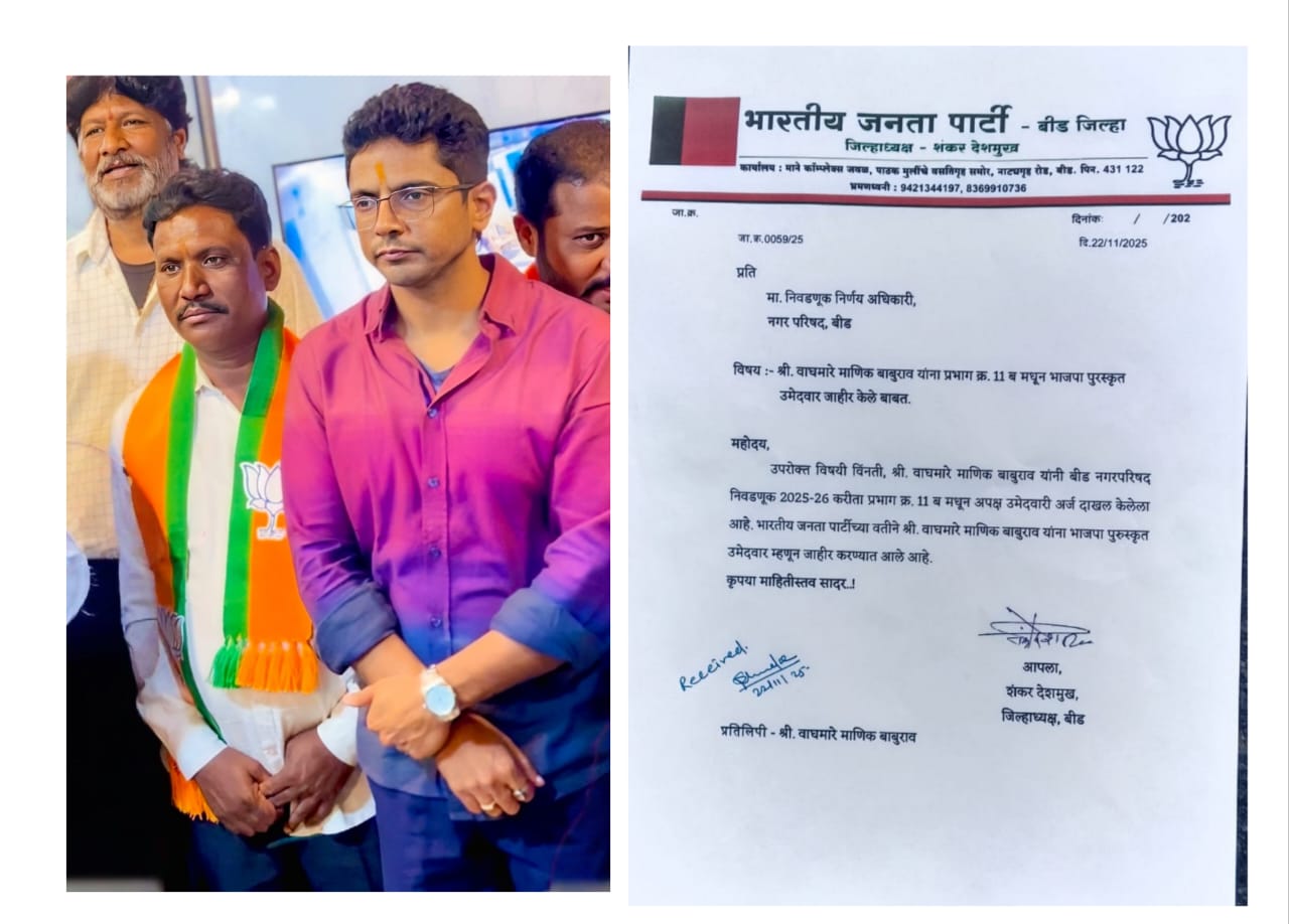 बीड नगरपरिषद निवडणुकीत प्रभाग ११ ‘ब’ मधून माणिक वाघमारे यांना भाजपचे पुरस्कृत उमेदवार म्हणून घोषित करण्यात आले आहे. डॉ.योगेश क्षीरसागर यांनी ऐन निवडणुकीच्या पार्श्वभूमीवर भाजपमध्ये प्रवेश करून नगरसेवक पदाच्या सर्वच जागांवर सक्षम उमेदवार उभे केले आहेत. दरम्यान, प्रभाग ११ ‘ब’ मधील भाजपचे उमेदवार इर्शाद शेख यांच्या अर्जावर विरोधकांनी आक्षेप घेतला होता. तांत्रिक कारणांमुळे त्यांचा अर्ज अवैध ठरल्यानंतर पक्षाला पर्यायी उमेदवार जाहीर करावा लागला. त्यानुसार जिल्हाध्यक्ष शंकर देशमुख यांनी माणिक बाबुराव वाघमारे यांची अधिकृत पत्राद्वारे निवडणूक निर्णय अधिकाऱ्यांकडे नोंद केली. माणिक वाघमारे यांनी आपण संपूर्ण ताकदीने निवडणुकीच्या रिंगणात उतरलो असून डॉ.योगेश क्षीरसागर यांच्या नेतृत्वाखाली लढत आहोत, असे सांगितले. प्रभागातील सर्व मतदारांनी आपले सहकार्य द्यावे, असे आवाहनही त्यांनी केले आहे.