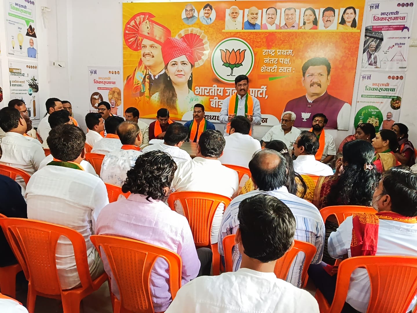 सर्व पदाधिकारी, कार्यकर्त्यांनी डोअर टू डोअर फिरून सरकारची जनसामान्य लोकांसाठी राबवलेली विकास कामे, बीड नगर परिषदेच्या माध्यमातून स्वच्छता, लाईट, पाणी, पार्किंग, महिला सुविधा, आदीसह सबका साथ, सबका विकास हे मा. नरेंद्रजी मोदींचे स्वप्न हाती घेऊन, बीड नगरपरिषदेवर भाजपाचा झेंडा फडकावण्यासाठी सर्वांनी ताकतीने काम करावे असे आवाहन करण्यात आले..