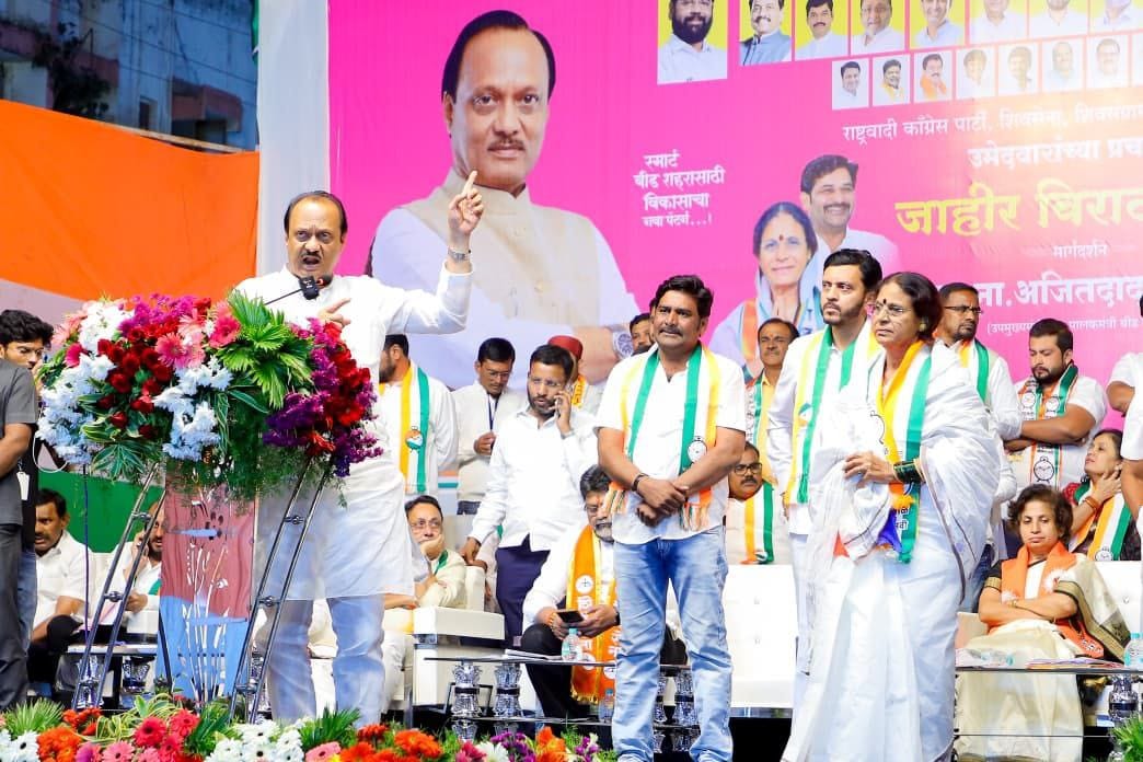 पुढे बोलताना ना. अजितदादा पवार म्हणाले की, बीड शहरात अनेक प्रश्न रखडत पडलेले आहेत. रस्ते नाहीत, नाल्या नाहीत, रस्त्याच्या मधोमध विद्युत खांब आहेत, मुला-मुलींना खेळण्यासाठी क्रीडांगण नाही, उद्यान नाही, आलेला निधी खर्च केलेला नाही, रस्त्याच्या बाजूला झाडे लावलेली नाहीत असे अनेक प्रश्न प्रलंबित आहेत. विरोधकांनी 35 वर्षे बीडची अवस्था बकाल करून टाकली, बारामती, पिंपरी चिंचवडचा विकास होवू शकतो मग बीडचा का नाही होवू शकत नाही ? असा प्रश्न उपस्थत करून तिकडे व्हिजन असणारे लोक आहेत आणि इकडे लोकांना वाऱ्यावर सोडून स्वतःचे घर भरणारे लोक असल्यामुळे आपली अवस्था अशी झालेली आहे. या भागातील खासदार झाले, आमदार झाले यांनी आत्तापर्यंत काय केले ? झोपा काढल्या का ? असा सवालही त्यांनी उपस्थित केला. ज्ञानराधा, साईराम, माँसाहेब आणि छत्रपती अशा पतसंस्थांच्या कुटे, परभणे, शिंदे आणि भंडारी या लोकांनी सामान्य लोकांचा पैसा लुटला. त्यातल्या तिघांना आम्ही जेलमध्ये पाठवले, एक फरार आहे. चुकीला माफी नाही, काम करत असताना काही कठोर निर्णय घ्यावे लागतील तेंव्हा सुधारणा होतील आणि सुधारणा करण्यासाठी आपल्या विचाराची माणसं नगर परिषदेत पाठवावी लागतील. तुम्ही कचरा निर्माण करणाऱ्या माणसाला निवडून द्याल तर या बीडचा कचरा होईल स्वच्छता करणाऱ्या स्वच्छ विचाराच्या माझ्या माणसांना विजयी करा असे सांगून हावसे-नवसे-गवसे येतील, रात्रीतून गडबड करतील त्यांच्या भुलथापांना बळी पडू नका, येणाऱ्या 2 तारखेला घडी आणि धनुष्यबाण या चिन्हासमोरचे बटन दाबून मला काम करण्याची संधी द्या असे कळकळीचे आवाहन ना. अजितदादा पवार यांनी केले.
